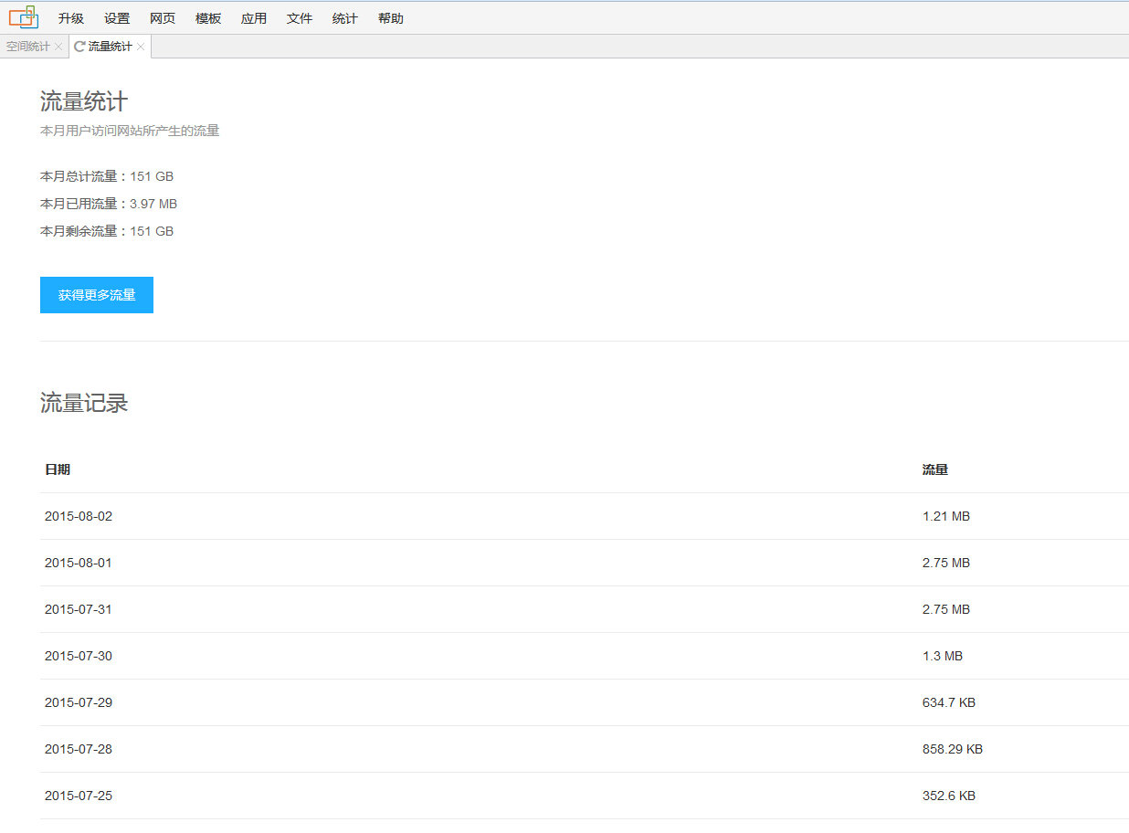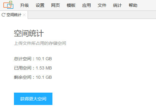 在个性化设置页面顶部点击统计,然后在下拉菜单中点击访问统计查看网站访问相关数据。点击流量统计查看网站流量使用情况。点击空间统计查看网站的空间使用情况。因为流量和空间需要在商店中购买,因此通过查看流量和空间使用情况可以方便的知道网站的流量和空间使用情况,可以及时购买更多的网站空间和流量。