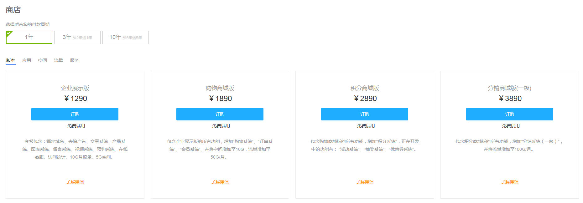 在网站管理后台或者个性化设置页面顶部点击升级 > 应用商店进入突唯阿系统在线商店。在商店中你可以选购网站版本如企业展示版,购物商城版,积分商城版,分销商城版(一级)。如果想先查看各个版本套餐的功能再决定购买,也可以先试用套餐。试用期为15天。除了网站版本以外,用户还可以选购应用,空间和流量,或订购突唯阿无忧建站服务。