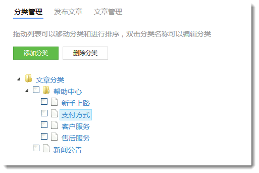 2. 在文章系统的文章分类管理页面上,用户可以添加、删除分类。双击分类可以编辑分类名称。如下图所示,通过选中一个分类,然后点击添加分类按钮可以在选中的分类下添加它的二级分类。
