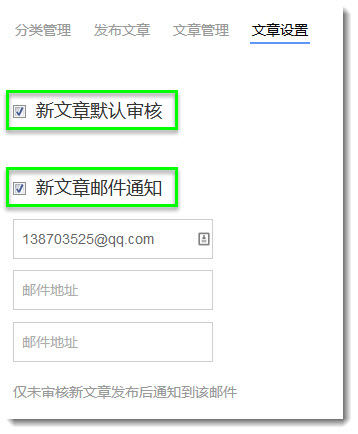 5. 在文章设置页面可以设置普通网站管理员发布文章后,是否在网页中显示。如果网站超级管理员在这里勾选新文章默认审核,那么在其他普通管理员发布文章后,文章的审核状态默认为已审核, 并能立刻显示在包含此文章的文章列表中。如果超级管理员在这里勾选新文章邮件通知,那么普通管理员发布文章后,超级管理员会在第一时间收到邮件提醒。并对发布的文章做审核通过或不通过的处理。