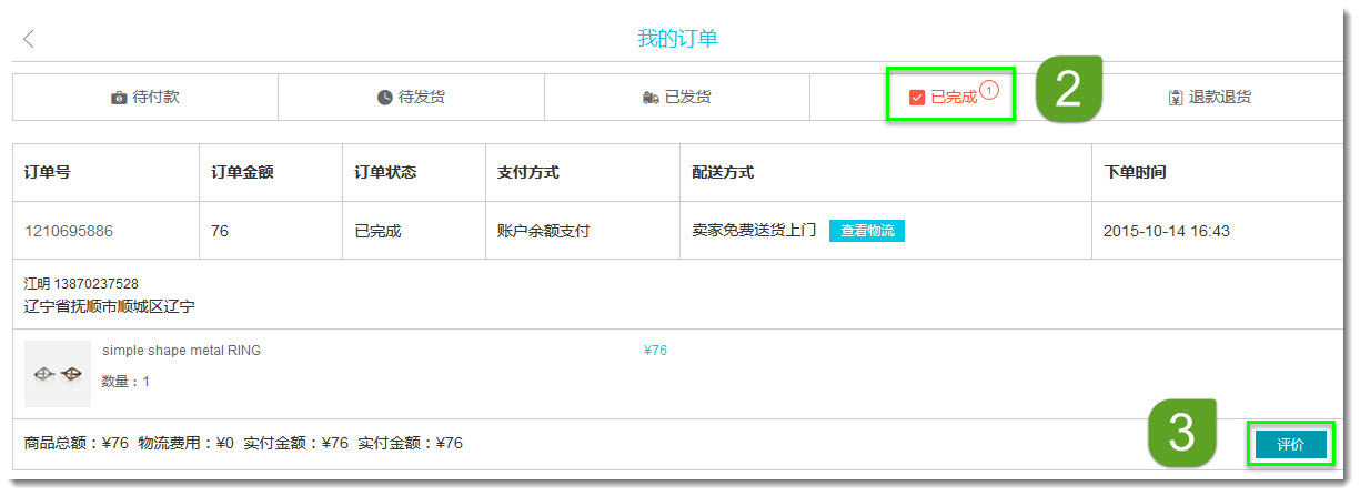 5. 点击已完成 > 点击评价按钮会弹出评价窗口。
