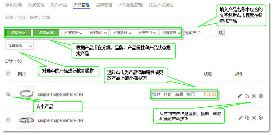 6. 在品牌管理页面上,管理员可以查找,修改和删除添加的品牌。