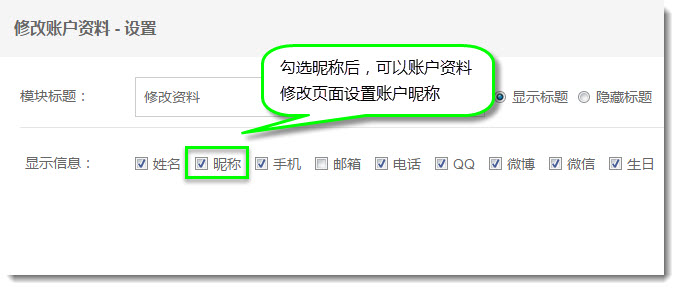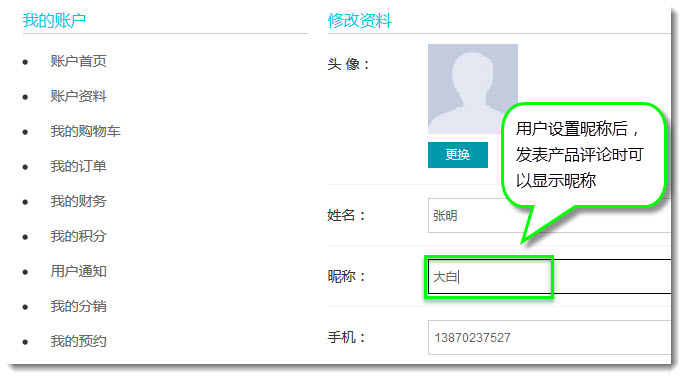 3. 网站管理员去网站后台顶部网页 > 应用网页 > 会员系统 > 修改资料页面中的修改资料插件设置窗口中开启了昵称。这样网站用户在修改资料页面设置了自己的昵称后,发表产品评论时,昵称将会显示在评论内容上方。
