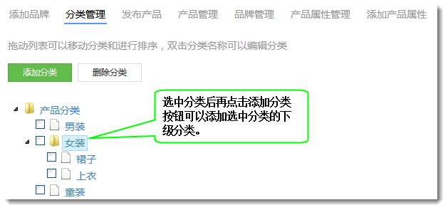 3. 在分类管理页面上管理员可以为网站中的产品添分类。点击添加分类按钮可以添加产品分类,选中一个添加的产品分类后<如下图所示>再次点击添加分类按钮可以添加此分类的下级分类,点击删除分类按钮可删除此分类。