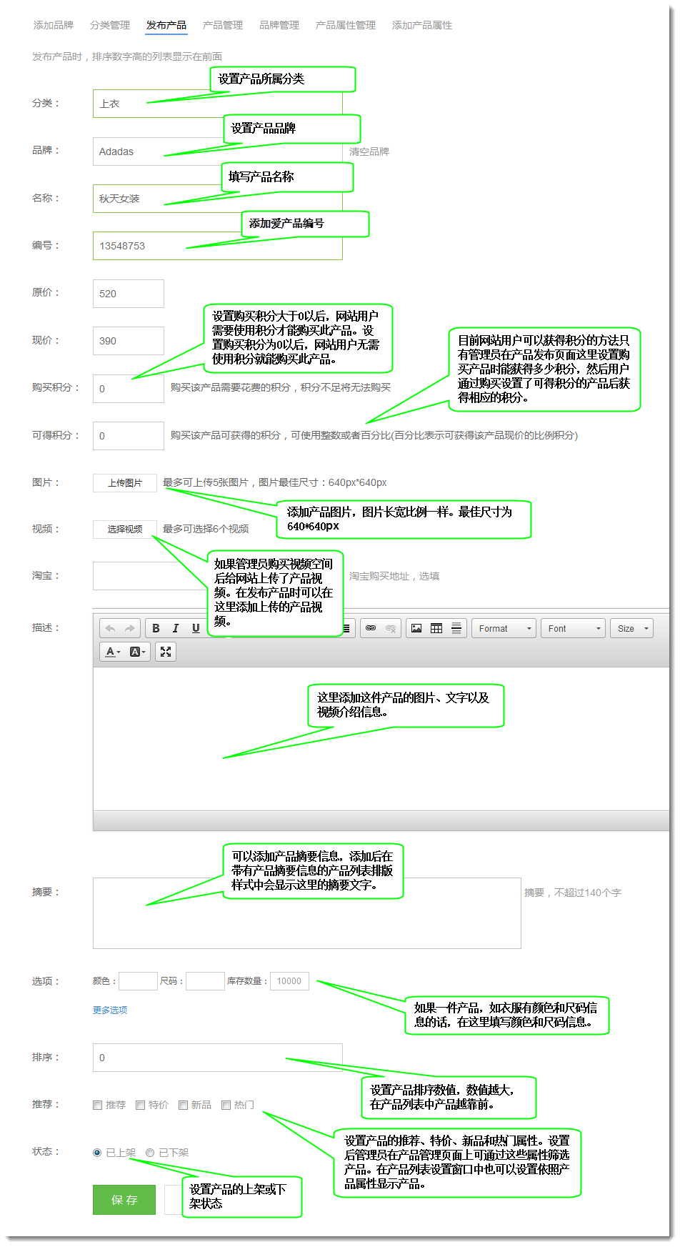 4. 管理员打开发布产品页面后,填写产品信息并保存可发布网站产品。