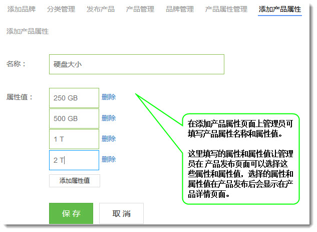 7. 管理员在添加产品属性页面上可以添加网站中所有产品的属性和属性值。