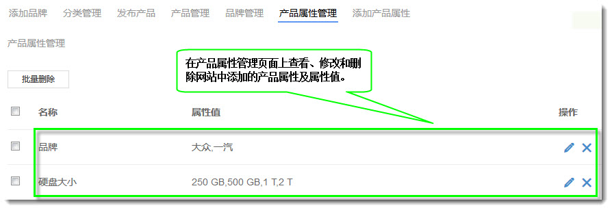 8. 在产品属性管理页面上查看、修改和删除网站中添加的产品属性及属性值。