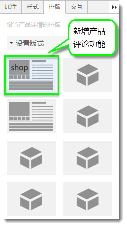 2. 然后去到产品详情所在的页面 > 选择产品详情插件 > 在右侧选择排版面板 > 设置当前产品详情插件为第一个排版样式。设置好后,用户的评论才能够在这个页面的产品详情插件中显示出来。