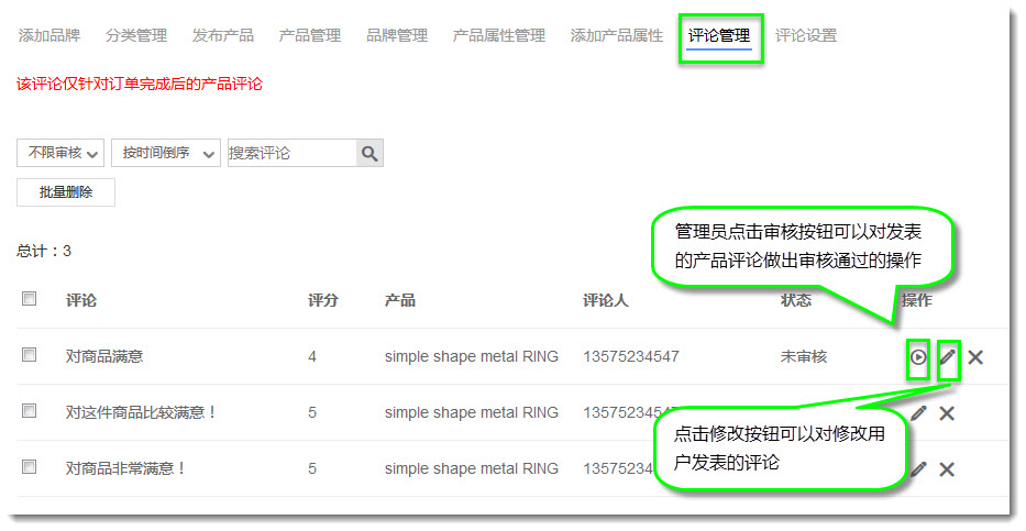 7. 如果管理员在应用> 产品系统 >评论设置页面上设置了评论需要通过审核才能通过,那么在用户发表产品评论后,管理员可以在应用 > 产品系统 > 评论管理页面上审核或修改用户评论。