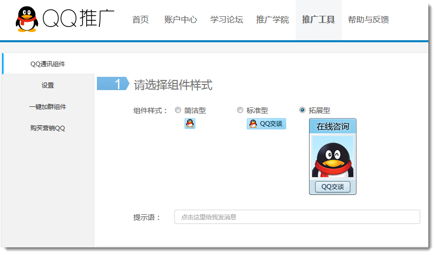 你可以自己创建一张图片作为网站QQ在线客服功能的按钮图片。也可以使用上图中的拓展型下方的QQ图片。你可以通过截图工具<如QQ截图>把这张图片保存到桌面然后把图片上传到文件中心备用。