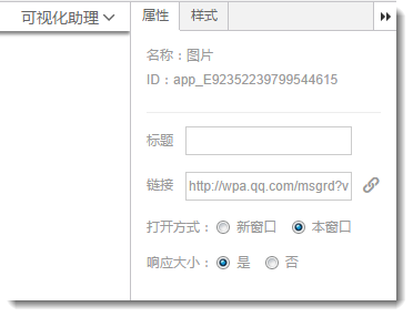 最后在网页中添加一个图片插件,然后把图片设置为刚才上传到文件中心的QQ图片。最后设置图片插件的链接地址为刚才复制的代码。