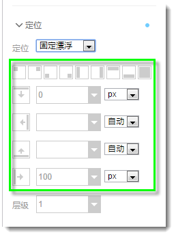 然后选中图片插件,并在右侧的样式面板中,打开默认 > 定位,在定位下拉选项中选择 固定漂浮 然后在下方的按钮中点击调整图片的位置。可以通过设置图片距离浏览器窗口上下左右4个方向的距离来进一步调整图片在网页中的位置。