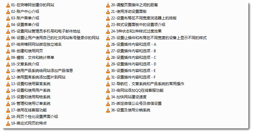 用户现在可以在这里下载超清版的视频教程(高清视频1、高清视频2、高清视频3)。也可以去土豆视频网站在线观看视频。熟悉使用突唯阿平台创建网站。建议新用户和老用户都先花几个小时的时间把视频教程从头到尾看完,然后去设置网站。这样在设置网站的时候知道什么样的页面效果用什么样的插件实现,以及如何实现这些效果。另外,完整看过一遍视频后还可以在设置网站过程中遇到问题时知道这样的问题在视频教程中有没有相关解释。这样用户能够自己借助视频教程和帮助网站解决遇到的问题。