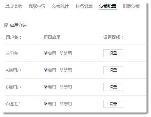 2. 在网站管理后台顶部菜单,应用 > 分销系统中的分销设置页面上,网站管理员可以启用分销功能,然后在默认未分组和其他用户分组中分别开启分销功能。这样使用分销链接在网站中注册的用户就能在默认的未分组和其他开启了分销功能的分组<如:A组用户和B组用户>中享有分销系统提供的分销提成功能。