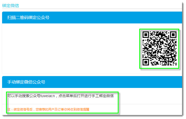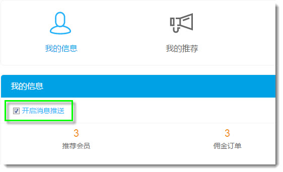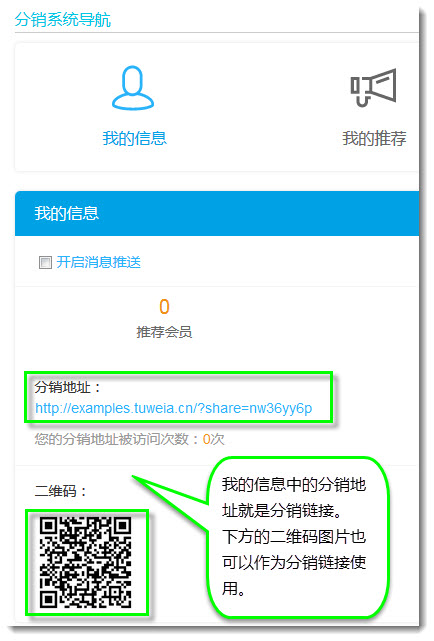 e. 绑定微信:勾选绑定微信后,i)如果管理员在网站管理后台顶部菜单,设置 > 微信设置中设置了微信公众账号,ii)并且网站分销用户在分销系统导航下方的我的信息标签页上勾选开启消息推送项并扫码绑定微信公众号后。此分销用户能够在自己的手机微信客户端中收到其下方推荐用户购买产品的消息通知。