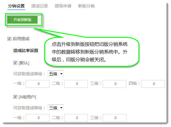 1. 如果你之前使用的是旧版分销系统,在网站管理后台顶部菜单,应用 > 分销系统中的旧版分销页面上点击升级到新版按钮把分销系统升级到新版。