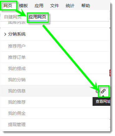 b. 在网站管理后台顶部菜单,网页 > 应用网页 > 分销系统中复制获取我的信息页面的站内链接地址,如下图所示。