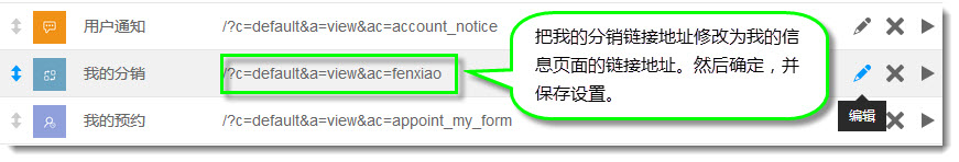 c. 在账户首页中的账户导航插件的设置窗口中修改我的分销导航项的链接地址为之前复制的我的信息页面的站内地址,如下图所示。