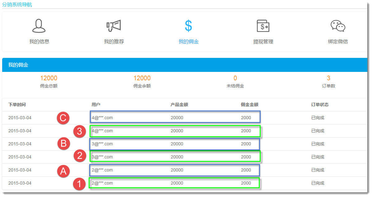 用户A可以获得的提成如下图所示,获得下级分销商订单产品分销价格总和的提成为(20000*0.1)加上(20000*0.1)加上 (20000*0.1)等于6000元<下图中的1,2,3>,获得其下方每一级分销用户的额外提成为(20000*0.1)加上 (20000*0.1) 加上(20000*0.1)等于6000元<下图中的A,B,C>,总计为12000元。