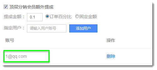 e. 在分销设置页面上顶级用户享有额外提成处,添加A为可以享有额外提成的顶级用户,并且额外提成设置为0.1<即10%>。