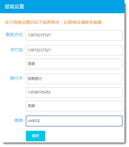 a. 在提现设置页面上填写接收网站管理员转账银行账户,或支付宝账户,或微信号。