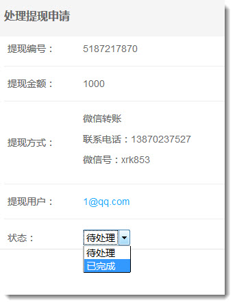 10. 网站管理员可以在分销系统的提现申请页面上查看网站分销用户提交的提现申请信息。并在转账结束后修改提现申请的状态为已完成。