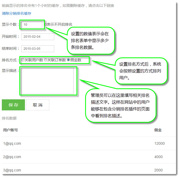 11. 网站管理员可以在分销系统的排名设置页面设置分销用户的排名方式,以及查看排名。
