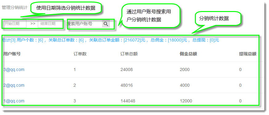 12. 网站管理员在分销系统的分销统计页面上可以通过筛选日期和搜索用户账号的方式查看网站中分销用户的分销统计数据。