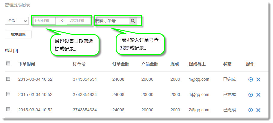 13. 网站管理员可以在分销系统的提成记录页面通过筛选日期和搜索订单号的方式查看详细的用户提成记录。