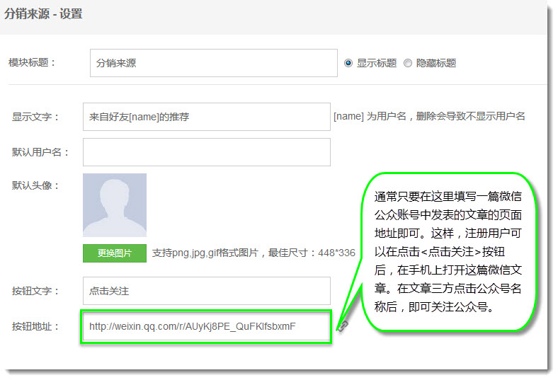 14. 使用分销系统中的分销来源插件,可以让网站中的用户 B 在手机上通过用户 A 的分销链接打开网站时,看见A在网站中的会员头像(或A的微信账户头像,前提是A是通过微信注册网站账户的)。