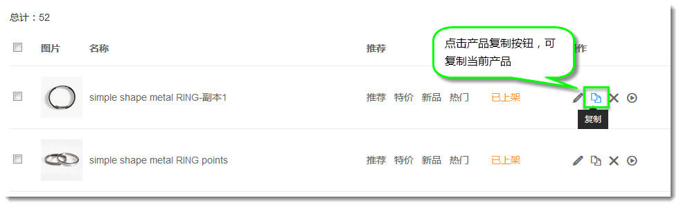 在产品系统 > 产品管理页面上,网站管理员现在可以通过点击某一个产品右侧的复制按钮复制当前产品。使用此方法可以快速发布因属性不同导致价格不一样的同一类产品。