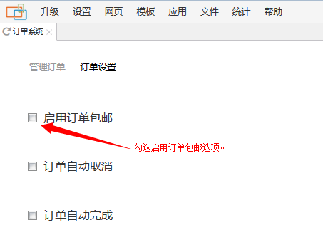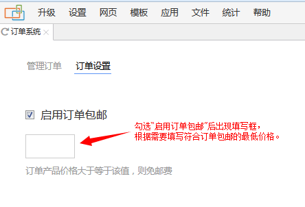 进入网站后台的“应用”菜单中 “订单系统”,在“订单设置”页面勾选“启用订单包邮”,并在下方出现的填写框中填写订单价格。启用该功能的效果是当订单价格达到或超过管理员所填写的价格则该订单会包邮。