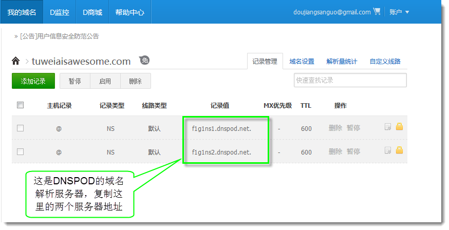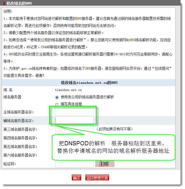 5. 在你申请域名的网站上找到域名解析服务器地址,并替换成DNSPOD的域名解析服务器的地址。