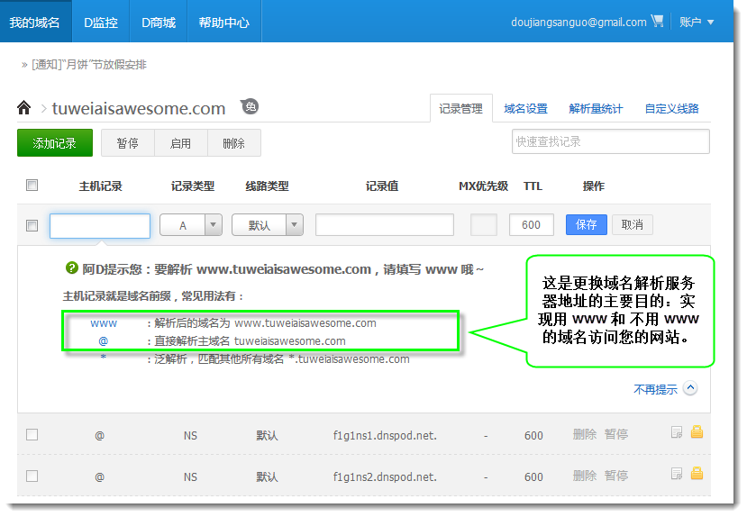 6. 替换后就可以在DNSPOD上添加主机记录为 www 和 @ 的解析记录了。