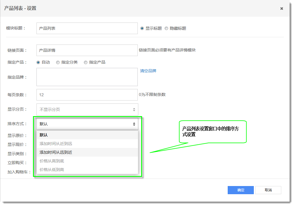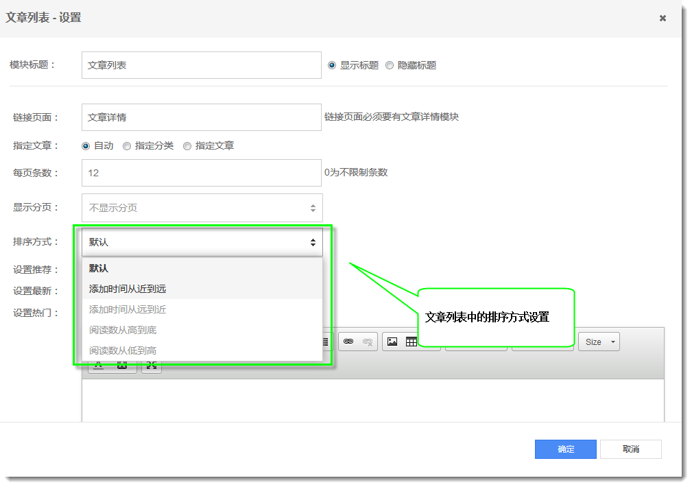 1. 在文章列表或产品列表设置窗口中通过发布时间先后顺序或文章的浏览次数或产品价格高低的方式设置文章或产品的排序。