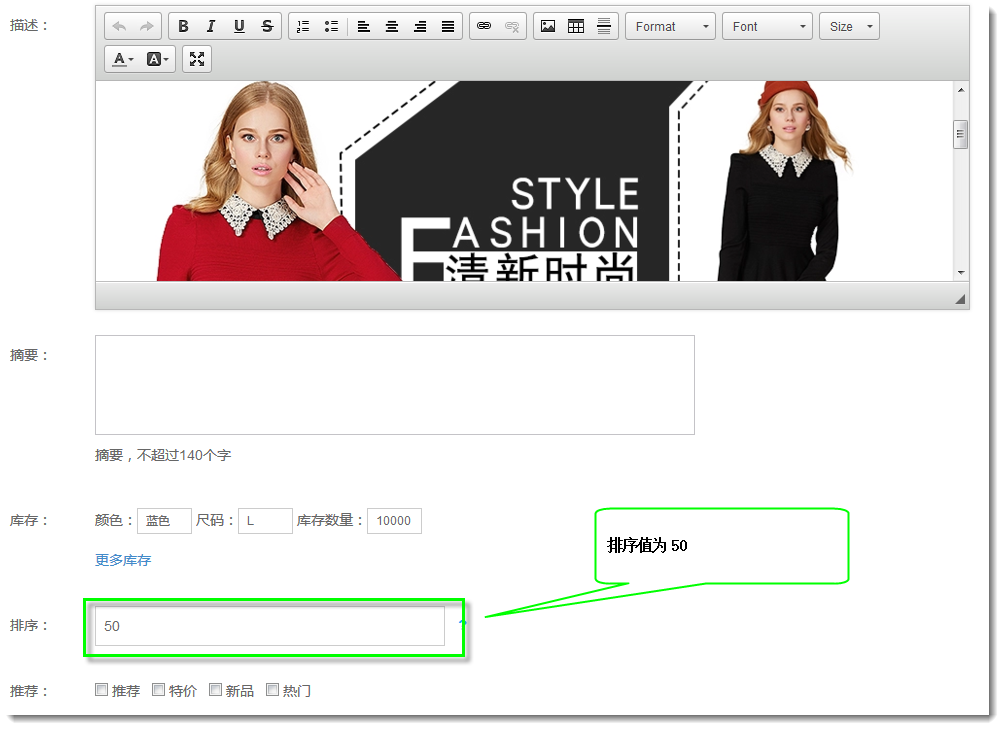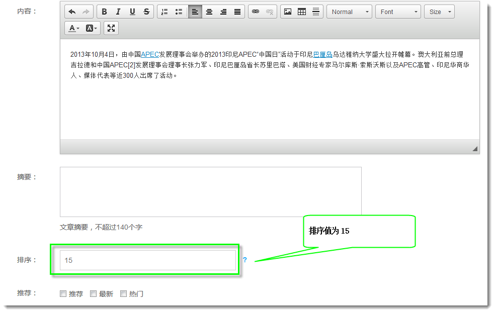 2. 通过给网站中的文章或产品设定排序数值的方法排序产品和文章。排序值越大的产品或文章会显示在排序值较小的产品或文章前面。默认有排序值的产品或文章会显示在没有排序值的产品或文章前面。
