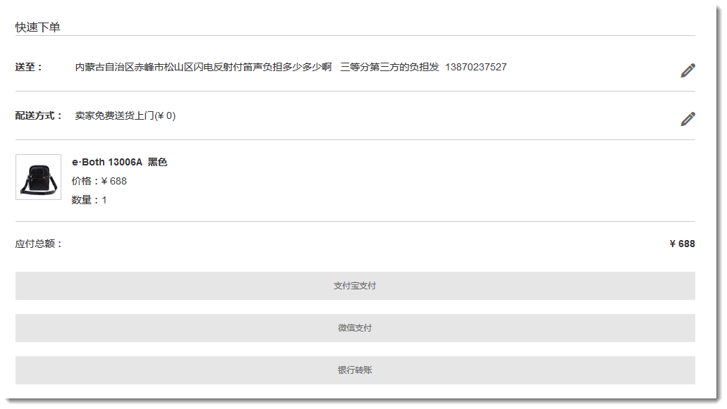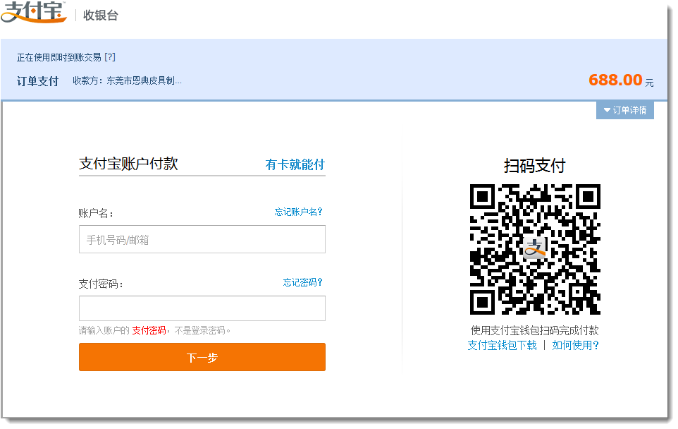 1. 用户在网站中下单后,在快速下单页面选择一种支付方式后点击支付,打开支付页面。