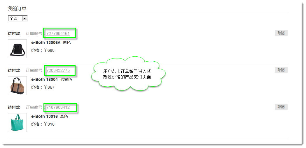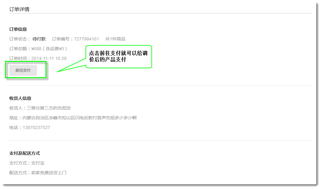 5. 在弹出的调价窗口中更改产品价格以后,用户就可在自己的订单页面点击订单编号进入修改过价格的产品支付页面。
