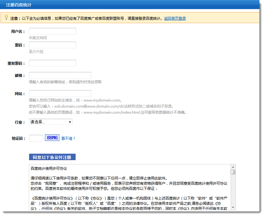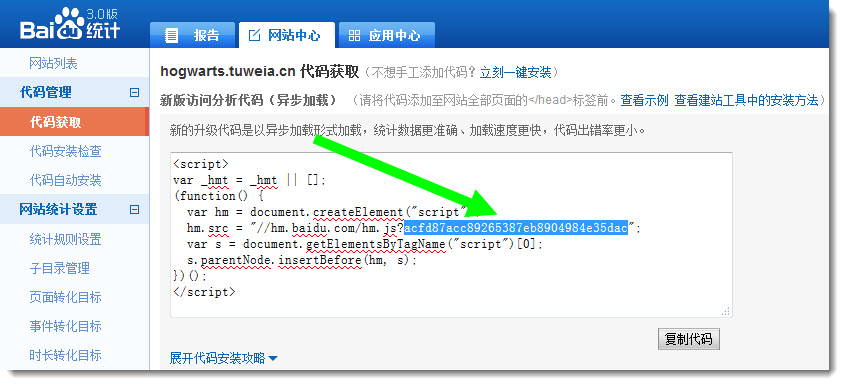 1. 在百度统计网站上注册帐号后登录。2. 添加网站时,填写网站在突唯阿的二级域名。3. 登录后在网站中心上点击,点击左侧代码获取,然后在右侧复制高亮显示的这段代码。4. 在突唯阿网站管理后台顶部统计菜单下方点击访问统计选项,然后在弹出的页面中启用百度统计功能。然后把刚才复制的代码粘贴在统计密匙后的填充框中。