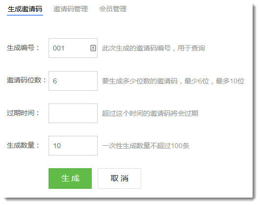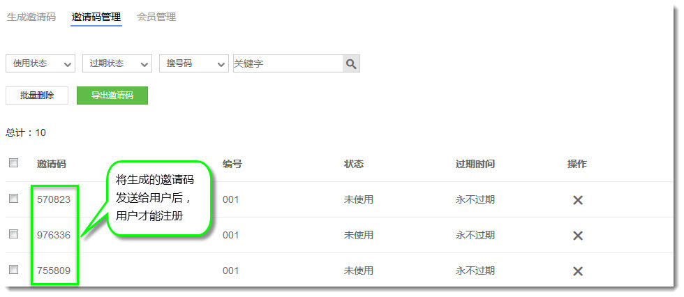 15. 在会员系统邀请码管理页面上,管理员可以生成邀请码,然后把邀请码发送给潜在的网站用户,让他们通过邀请码注册。
