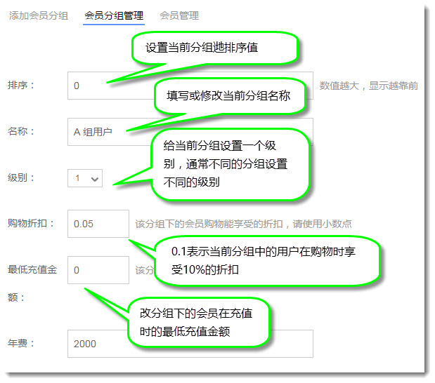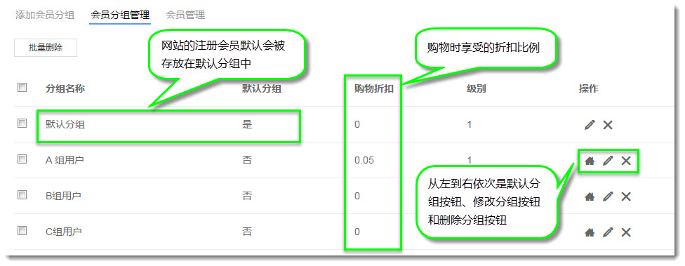 3. 首先,在会员分组管理页面上管理员可以添加、修改和删除会员分组。点击某一个会员分组右侧的修改分组按钮,进入当前会员分组的修改页面。