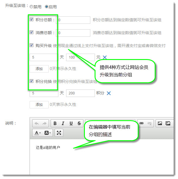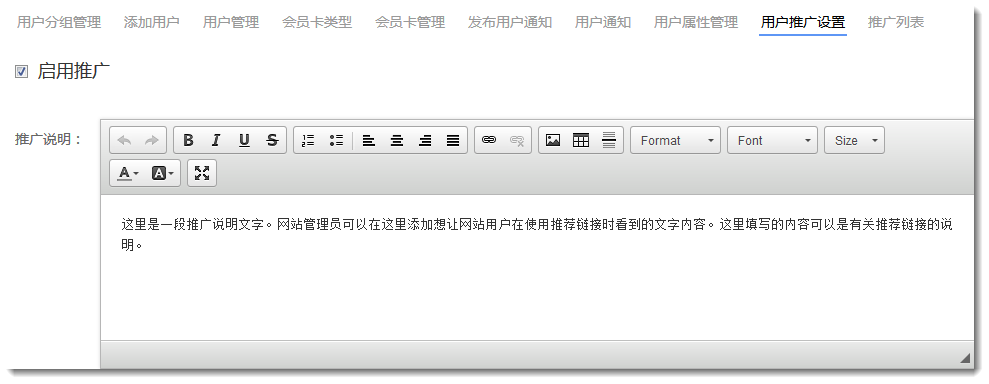 a. 在网站管理后台顶部会员系统中的会员推广设置页面上启用会员推广功能,然后在下方的编辑器中添加和推广活动有关的文字和图片说明,最后保存设置。