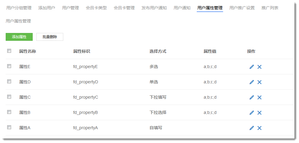 12. 在会员属性管理页面上,管理员可以为网站会员添加会员属性。添加好属性后,去页面上的注册插件、账户资料插件还有修改账户资料插件的设置窗口中设置显示这些添加的属性后,会员就可以在注册网站账户、修改会员资料的时候使用这些添加的属性。目前支持添加的用户属性有5种,即自填写,下拉选择,下拉填写,单选,多选。如下图所示: