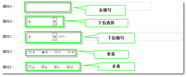 这些种类的属性添加后,网站管理员在页面中相应插件设置窗口设置显示这些属性后会员在页面上看到的样子如下图所示: