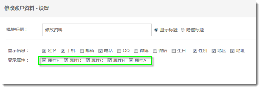 添加好属性和其下方的属性值后,网站管理员可以去网站页面中的注册插件、账户资料插件、修改账户资料插件的设置窗口中设置显示这些添加的属性。
