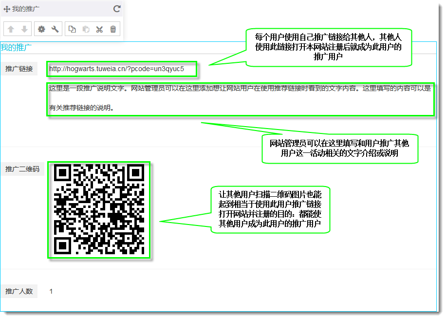 13. 使用会员系统中的会员推广功能可以让网站中的会员使用自己的推广链接为网站推广其他会员。推广方法就是让其他会员使用自己的推广链接或者扫描自己的推广二维码图片打开网站,并在网站中注册成为网站会员。这样网站管理员就可以在后台会员系统中的推广列表页面查看这些提供了推广链接或二维码图片给其他人使用的会员成功推广了多少人。