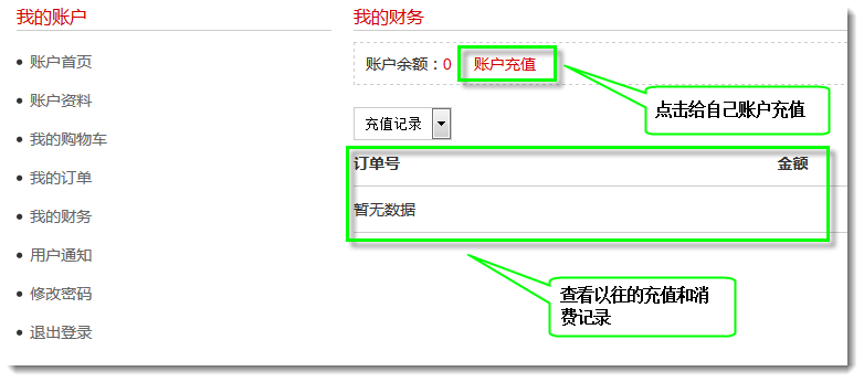b. 这样当会员登录网站后在我的财务页面右侧可以点击账户充值链接文字打开支付宝为自己的账户充值。