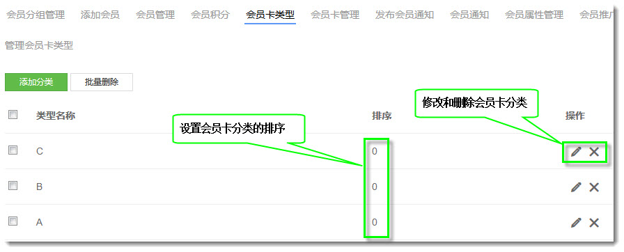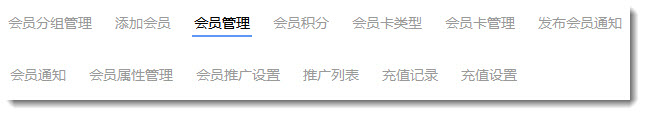 2.如下图所示, 在会员系统中有会员分组管理,添加会员,会员管理,会员积分,会员卡类型,会员卡管理,发布会员通知,会员通知,会员属性管理,会员推广设置,推广列表,充值记录,充值设置等页面。每个页面作为会员系统中某一方面功能的设置页面,网站管理员在这些页面设置后可以让网站依照管理员的方式实现这些会员系统中的功能。