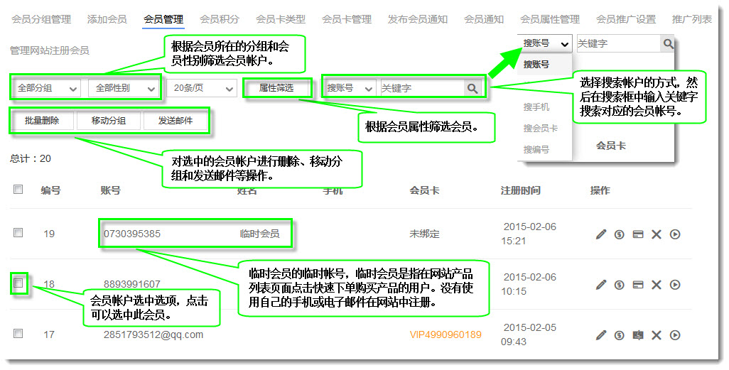 5. 在会员管理页面上管理员可以按照分组,性别,会员属性等方式筛选会员。也可以选择搜索条件搜索会员帐号。选中会员帐号后,可以删除,移动会员帐号分组,以及发送邮件给会员。