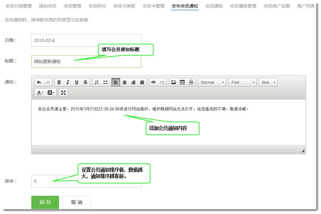 10. 在发布会员通知页面上,管理员可以发送通知给网站会员。网站会员登录网站后在会员通知页面上可以看到管理员发送的通知。